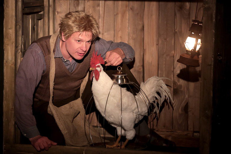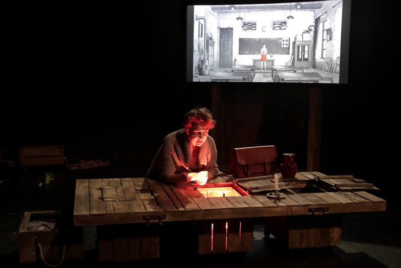 Christophe Laparra présente sa belle mise en scène de L’Ogrelet. Dans un écrin entièrement fait de caisses en bois, un écran projette régulièrement un dessin animé, tandis que les comédiens changent de costumes à vue et manipulent masques et marionnettes.